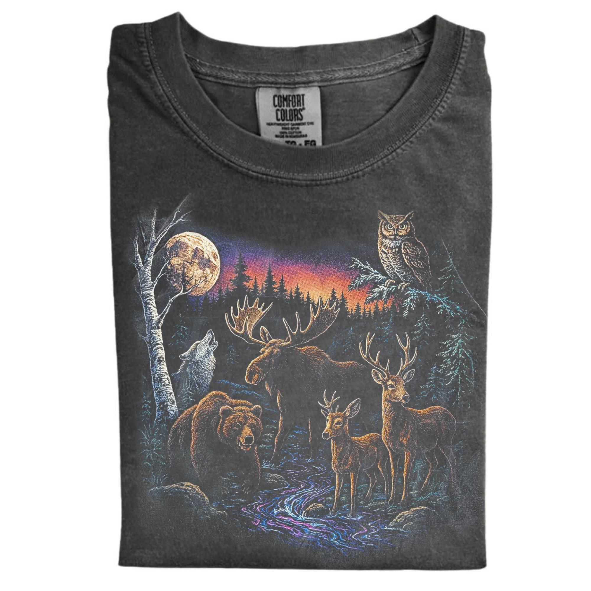 Comfort Color Wildlife Forest Animals Shirt, Moonlit Forest Wildlife Graphic T-Shirt, Bear Deer Wolf Moose Owl Shirt, Forest Nature T-Shirt, Wilderness Lover Graphic Tee, Gift for Men, Gift for Women, Crew Neck T-shirt, Trending T-shirt
