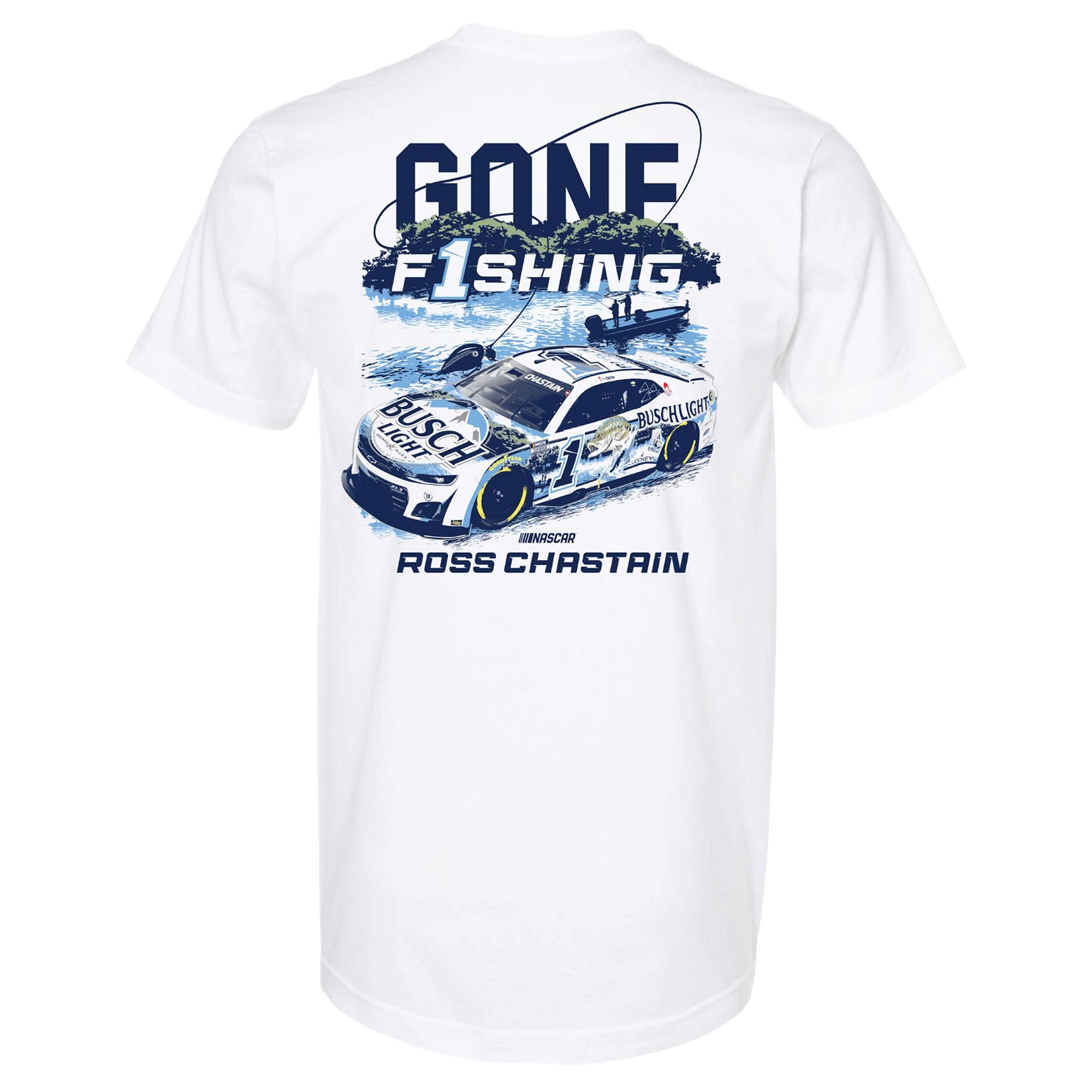 Ross Chastain Trackhouse Racing Team Collection White Gone Fishing Busch Light T-Shirt Unisex For Fans Racing