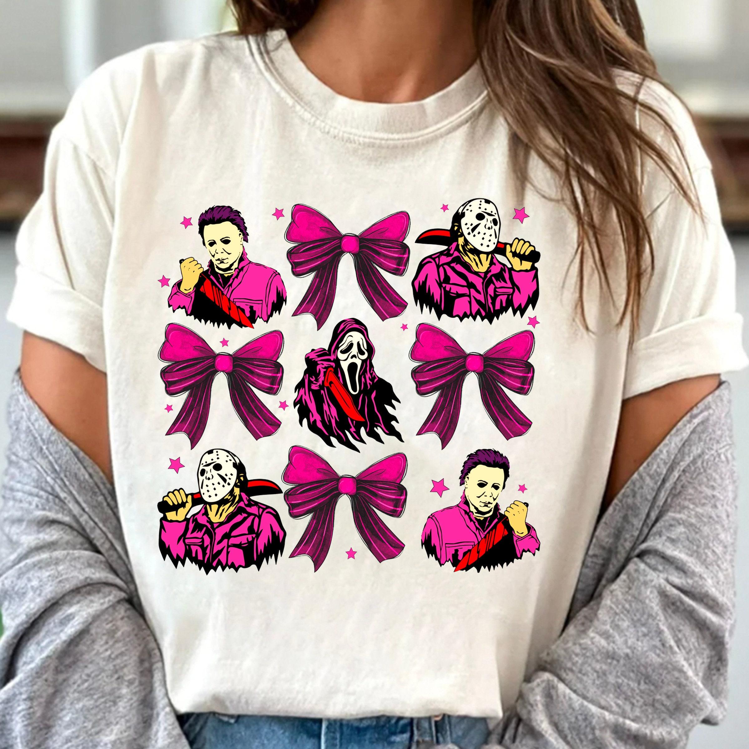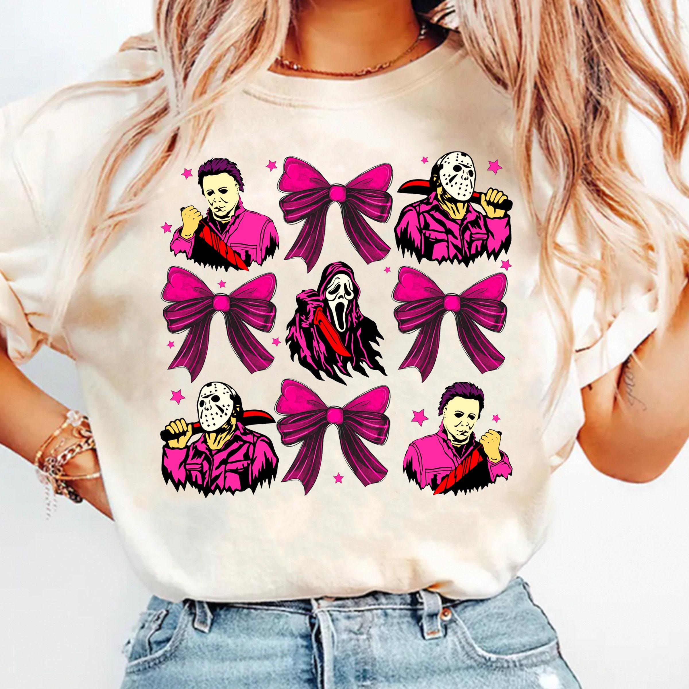 Pink Horror Halloween Shirt, Halloween Coquette Bow Tee, Halloween Gift, Retro Halloween Character Tshirt