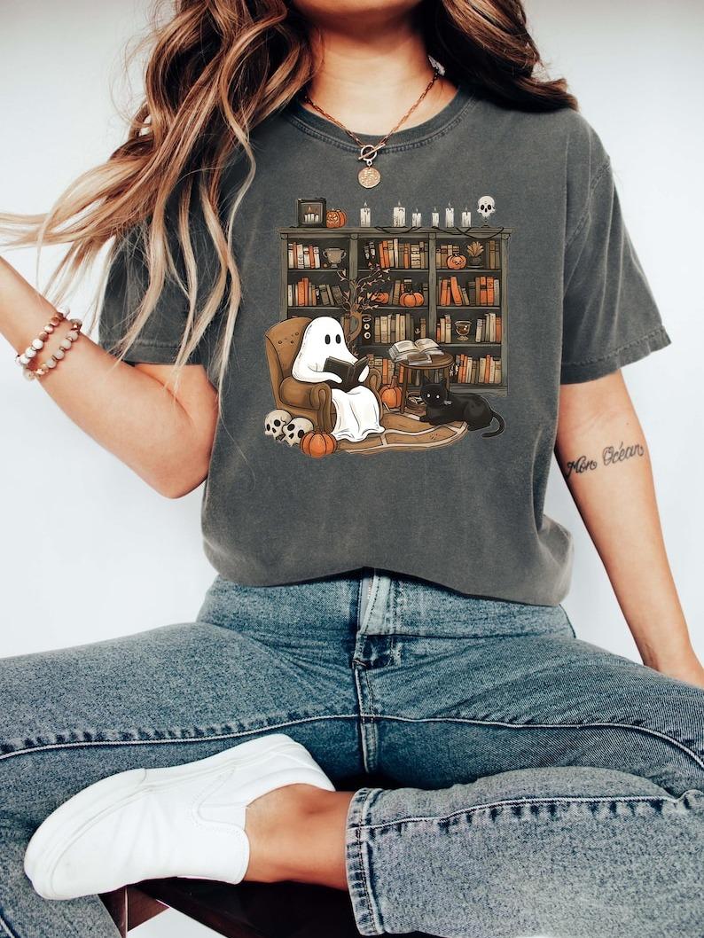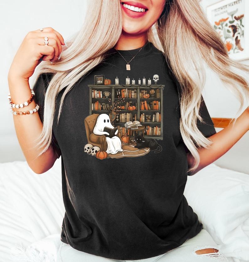 Ghost Reading Book T-shirt, Halloween Bookshelf Shirt, Ghostly Bookish Tee, Black Cat and Book Shirt, Cute Ghost Book PNG, Book Lover Halloween