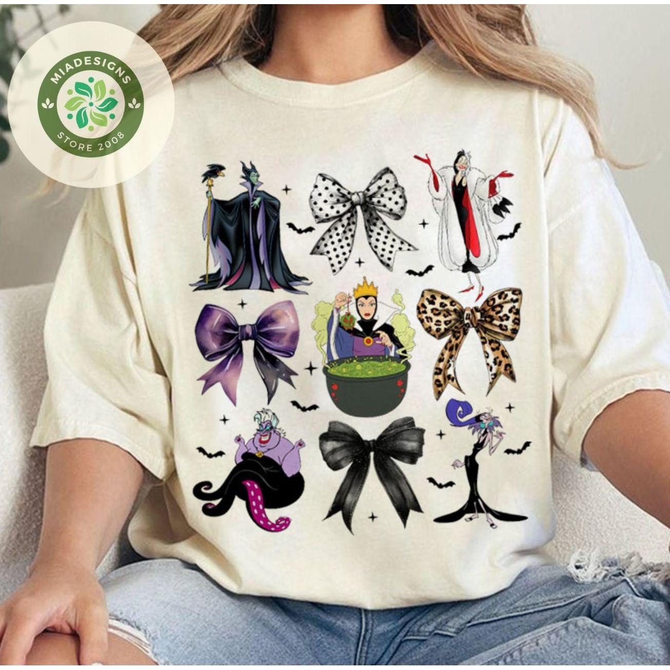 Coquette bows Disnnney Villains Shirt, Maleficent Evil Queen Cruella Halloween Shirt, WDW Disnnneyland Halloween Girls trip Bestie shirt