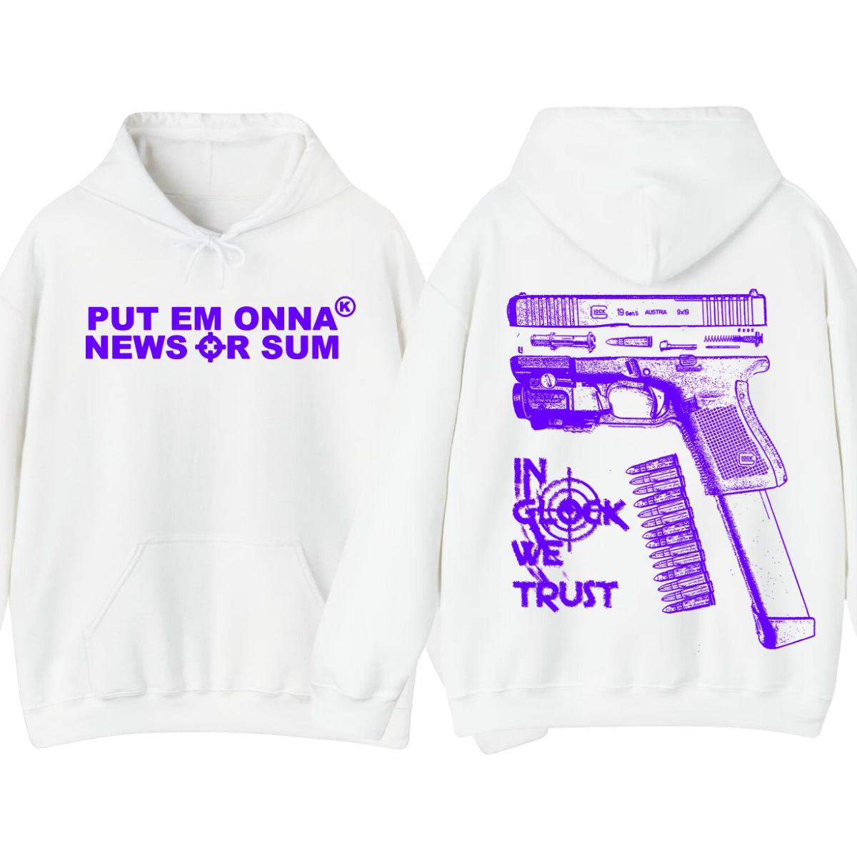 PUT EM ONNA NEWS OR SUM - IN GLOCK WE TRUST GILDAN Hoodie -Full color - Classic Menswear - Glock shirt - For her - for him, Sweatshirt, Hoodie