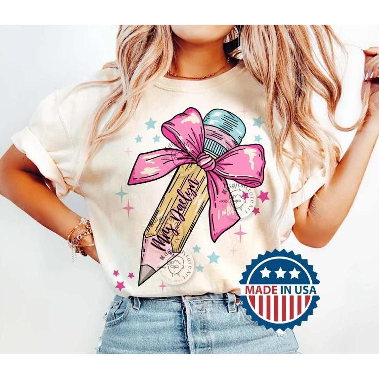 Pencil Bow Teacher Name Custom Shirt, Coquette Bow Teacher Shirt, Back to School Teacher Shirt, First Day School Shirt, Gift for Her, Gift for Him, Summer Outfits 2024