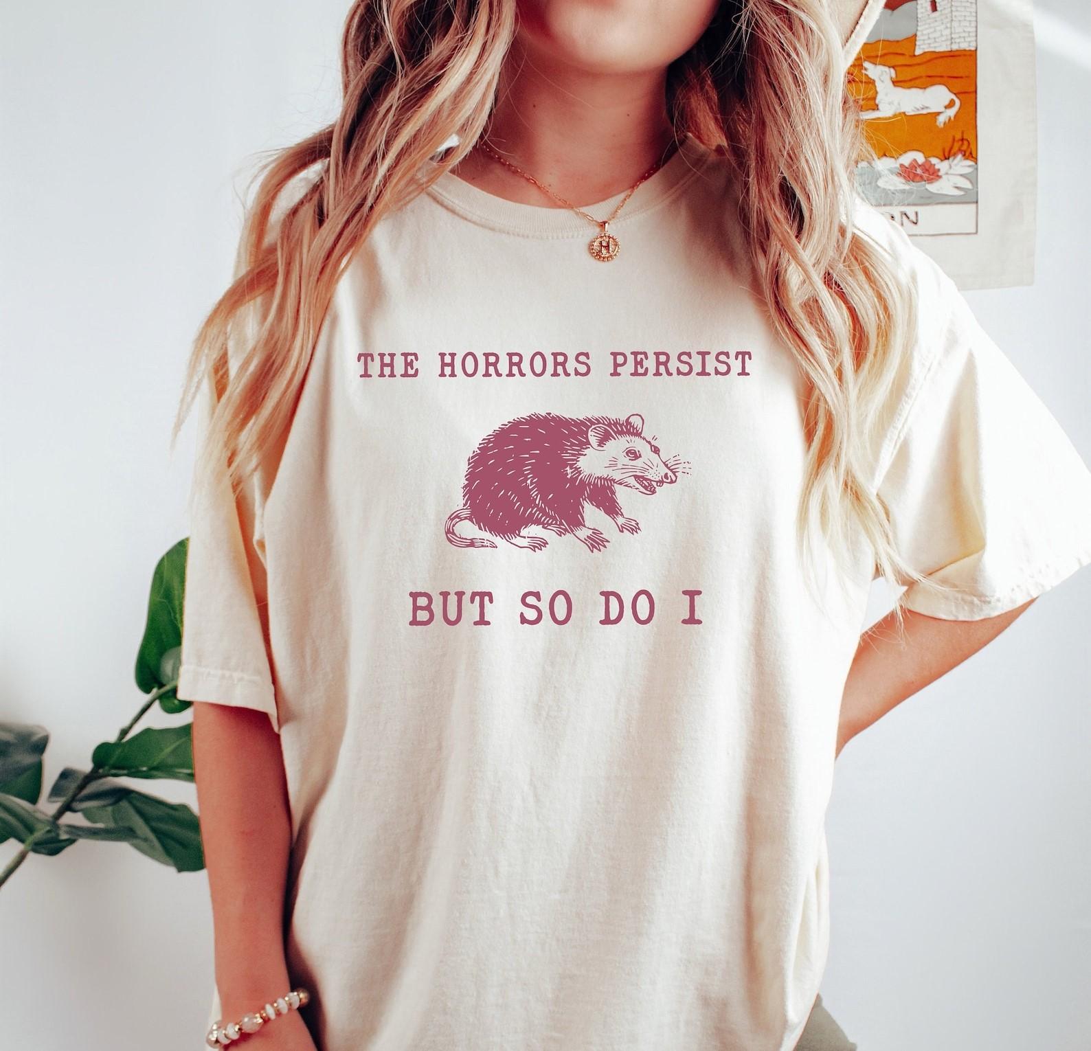 The Horrors Persist But So Do I, Raccoon Gift, Raccoon Sweatshirt, Trendy Woman Clothing Vintage T-shirt, Unisex T Shirt